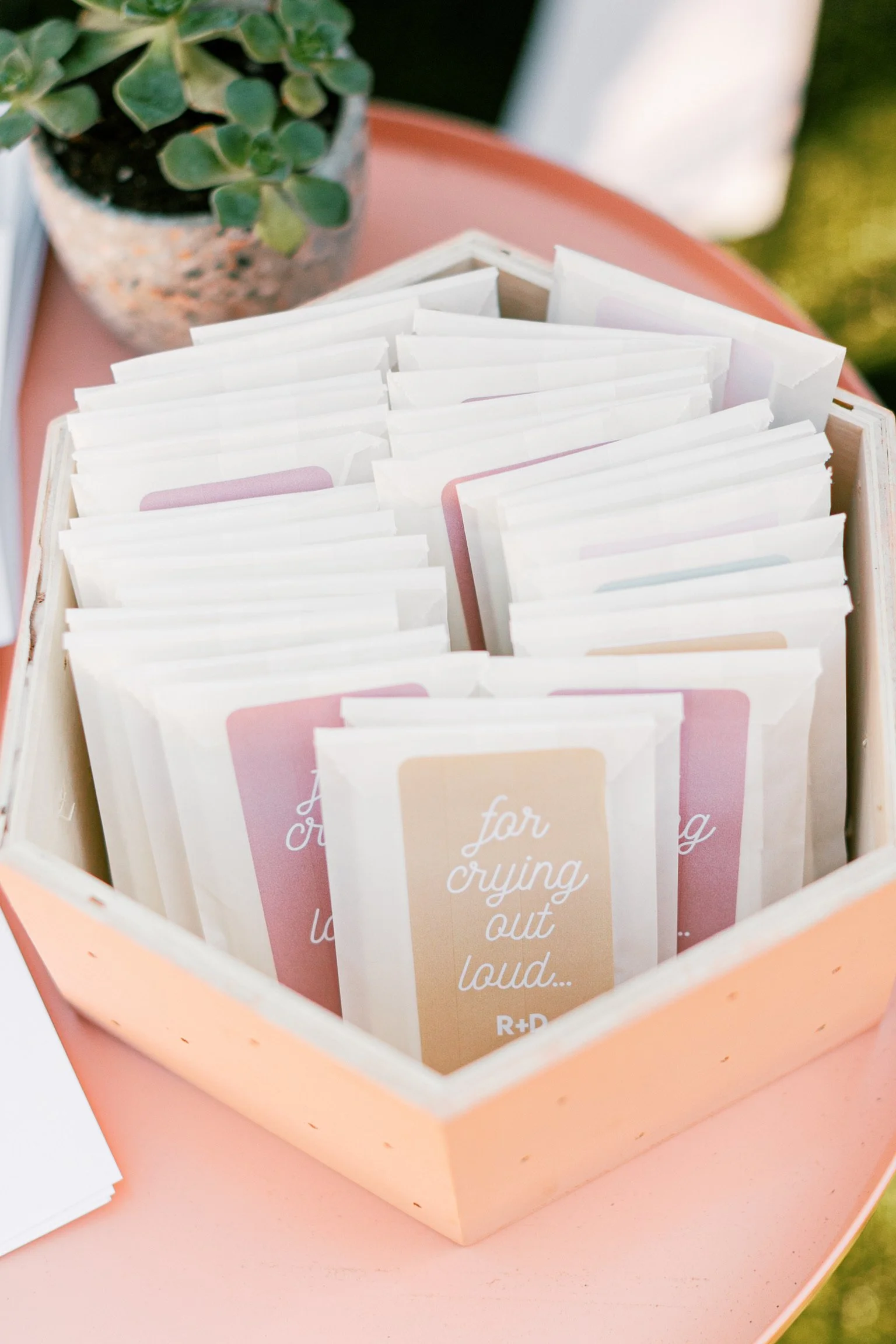 These tissue packets were a really simple DIY project that made for a really cute touch to our wedding ceremony. Let’s face it, there are a lot of mushy moments during a wedding ceremony and your guests are bound to shed a few happy tears! So why not offer a tissue packet for guests to take with them to their seat before the ceremony.