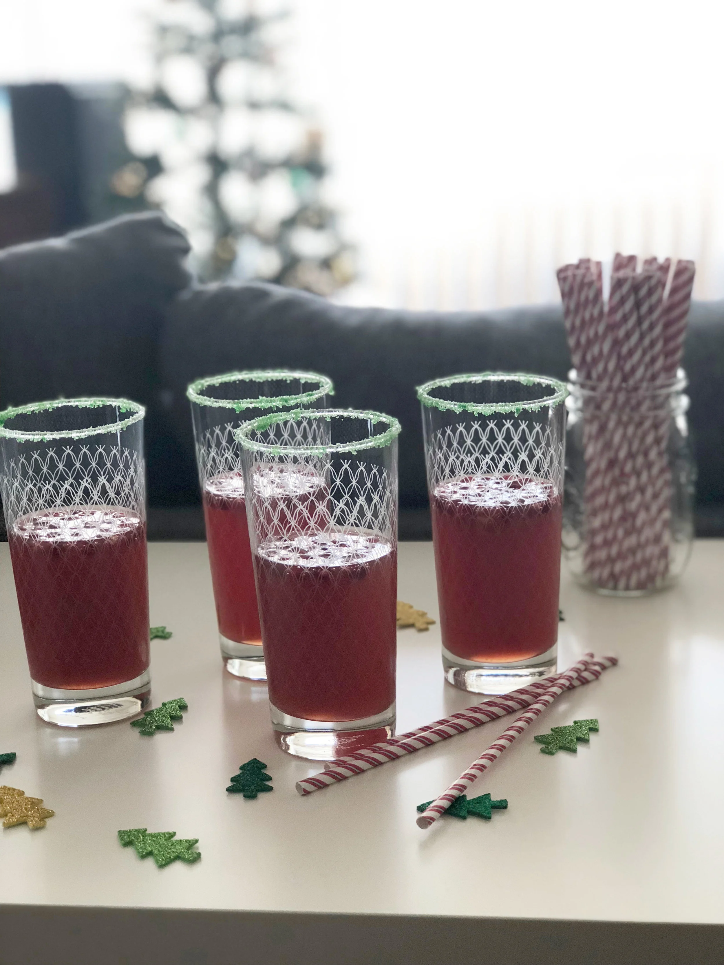 Ingredients: Sugar, green food coloring, pomegranate seeds, blood orange San Pellegrino, Prosecco, and Pomegranate juice