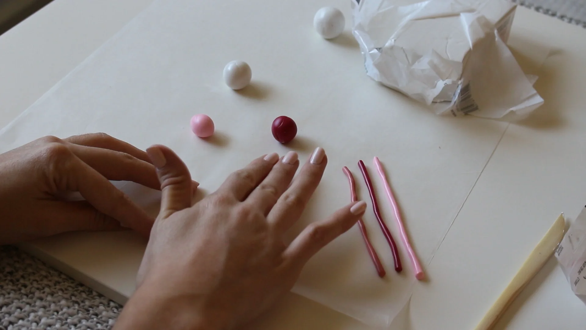 Step 1: Roll pink/red clay into small balls and white clay into larger balls.