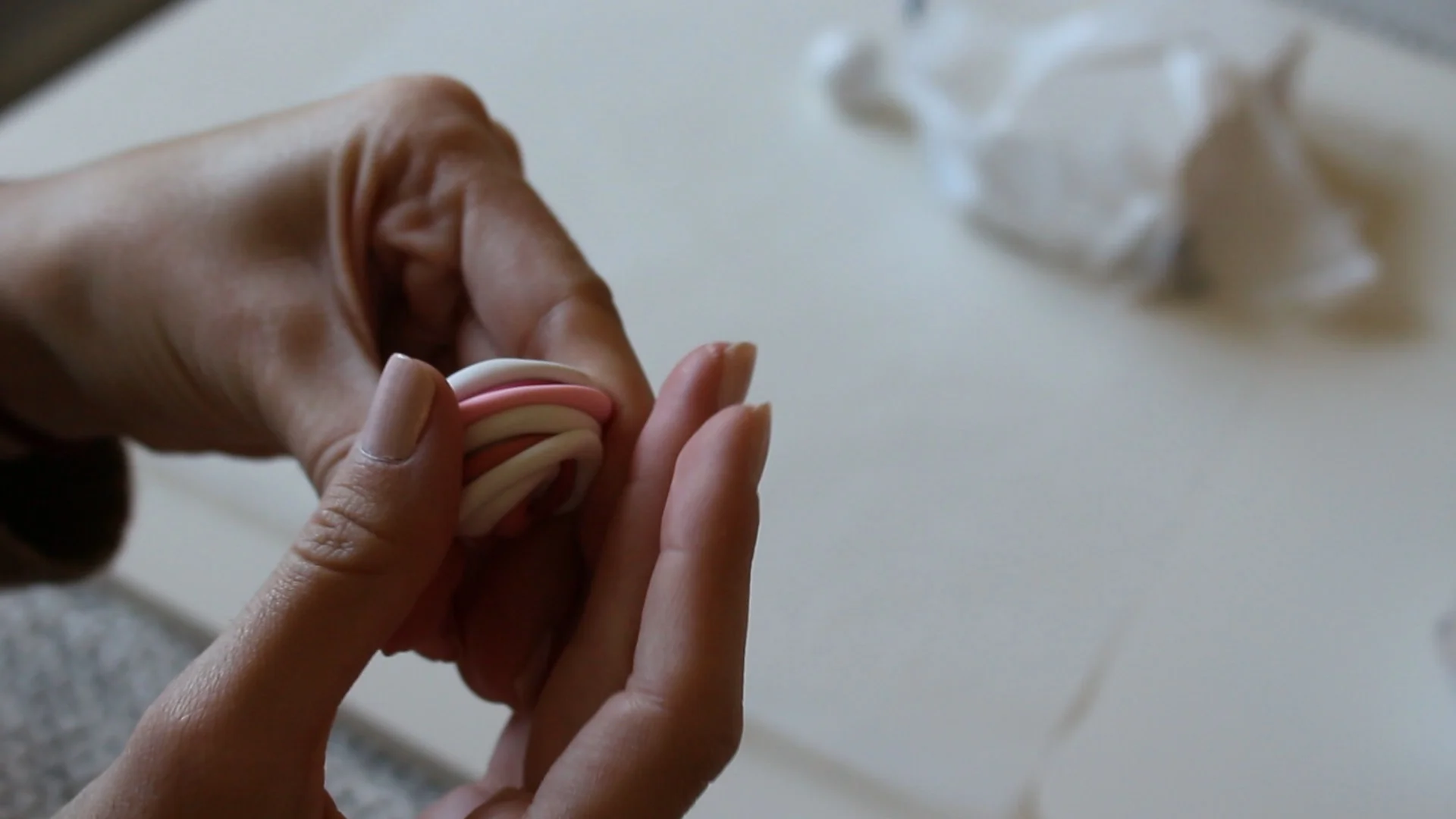 Supplies: polymer clay (pink, red, white), yarn, thin rope