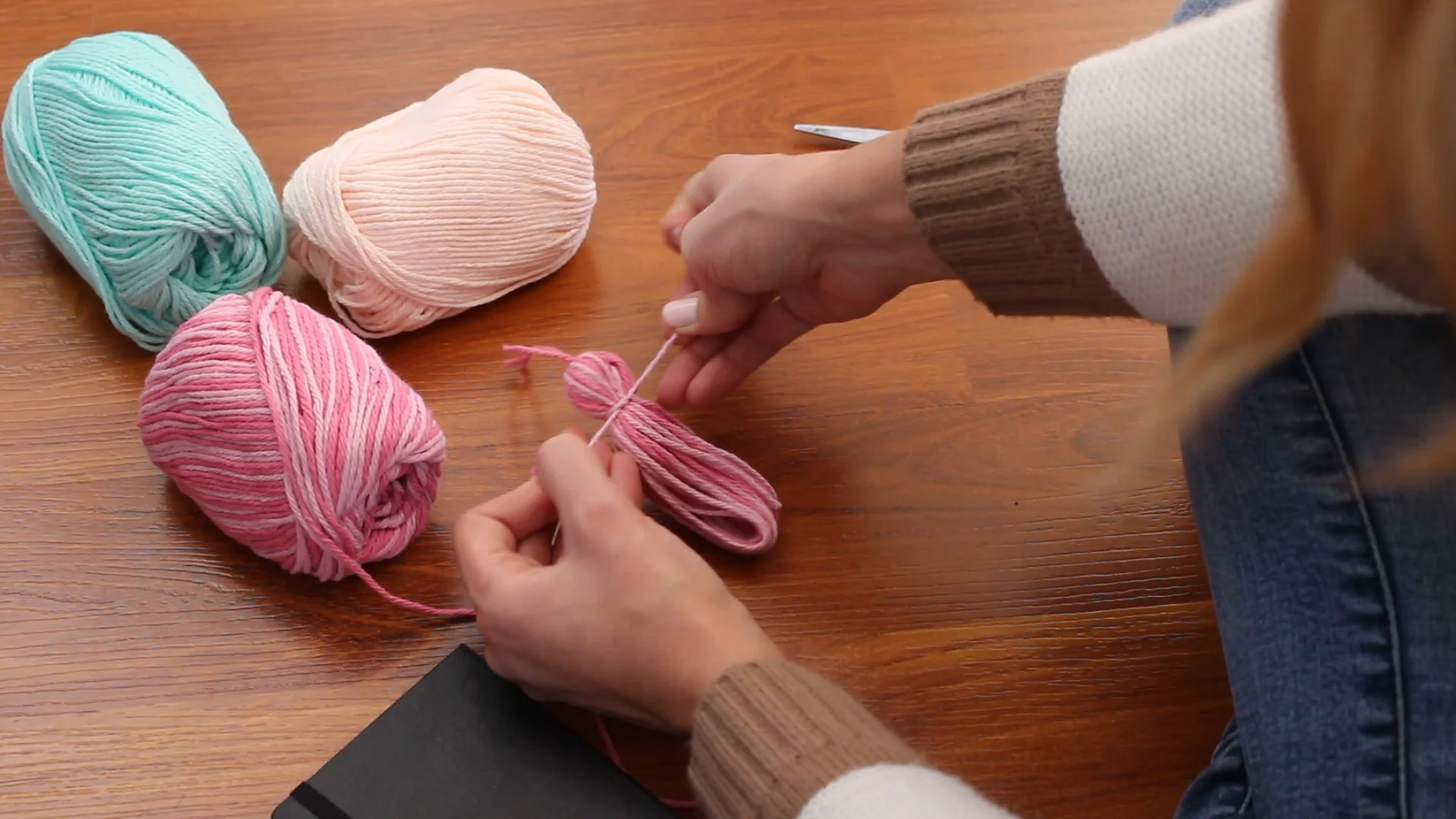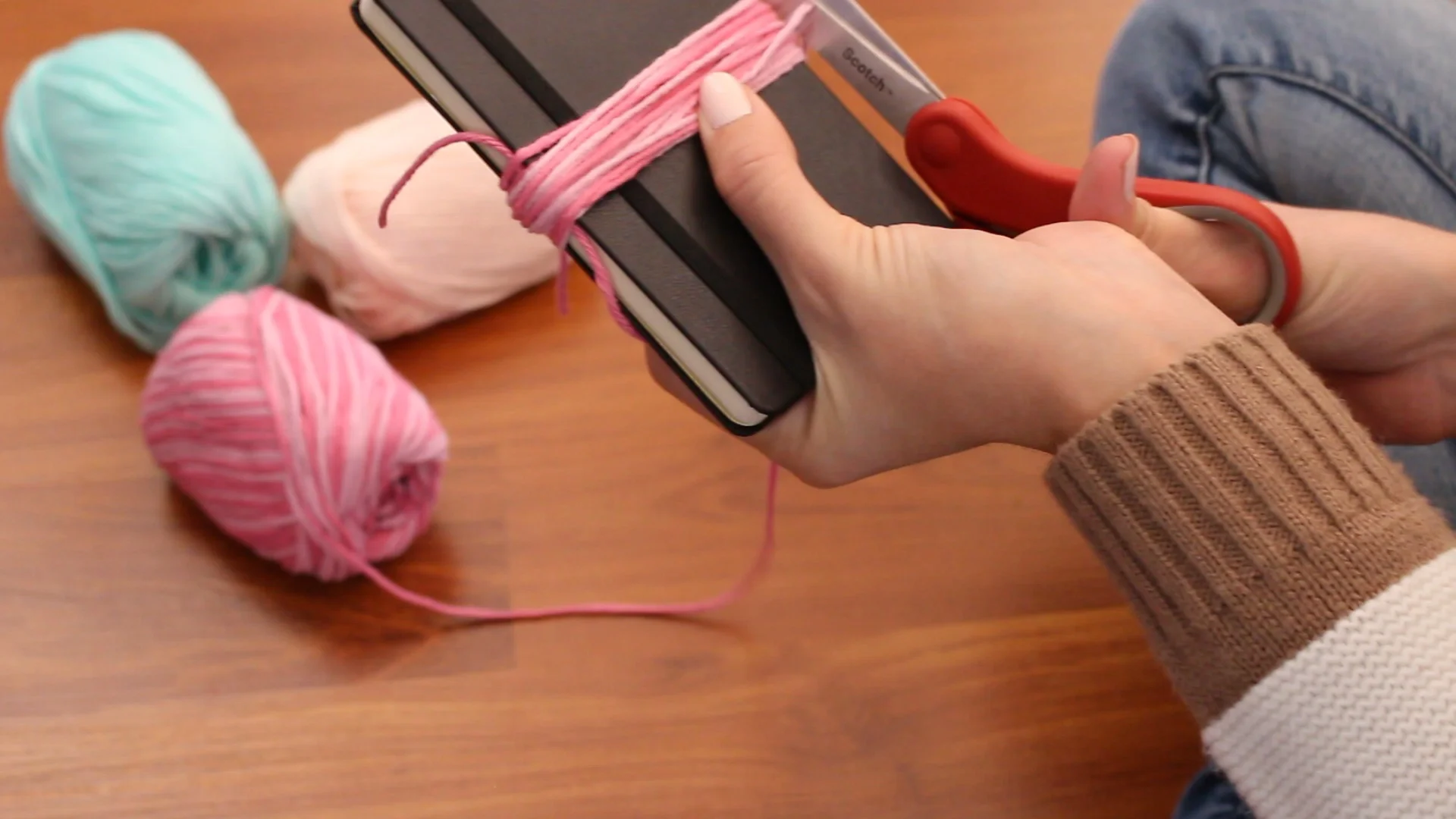 Step 9: Pull the yarn loops off the notebook carefully. Cut another small piece of yarn and use this to tie the yarn in the center.