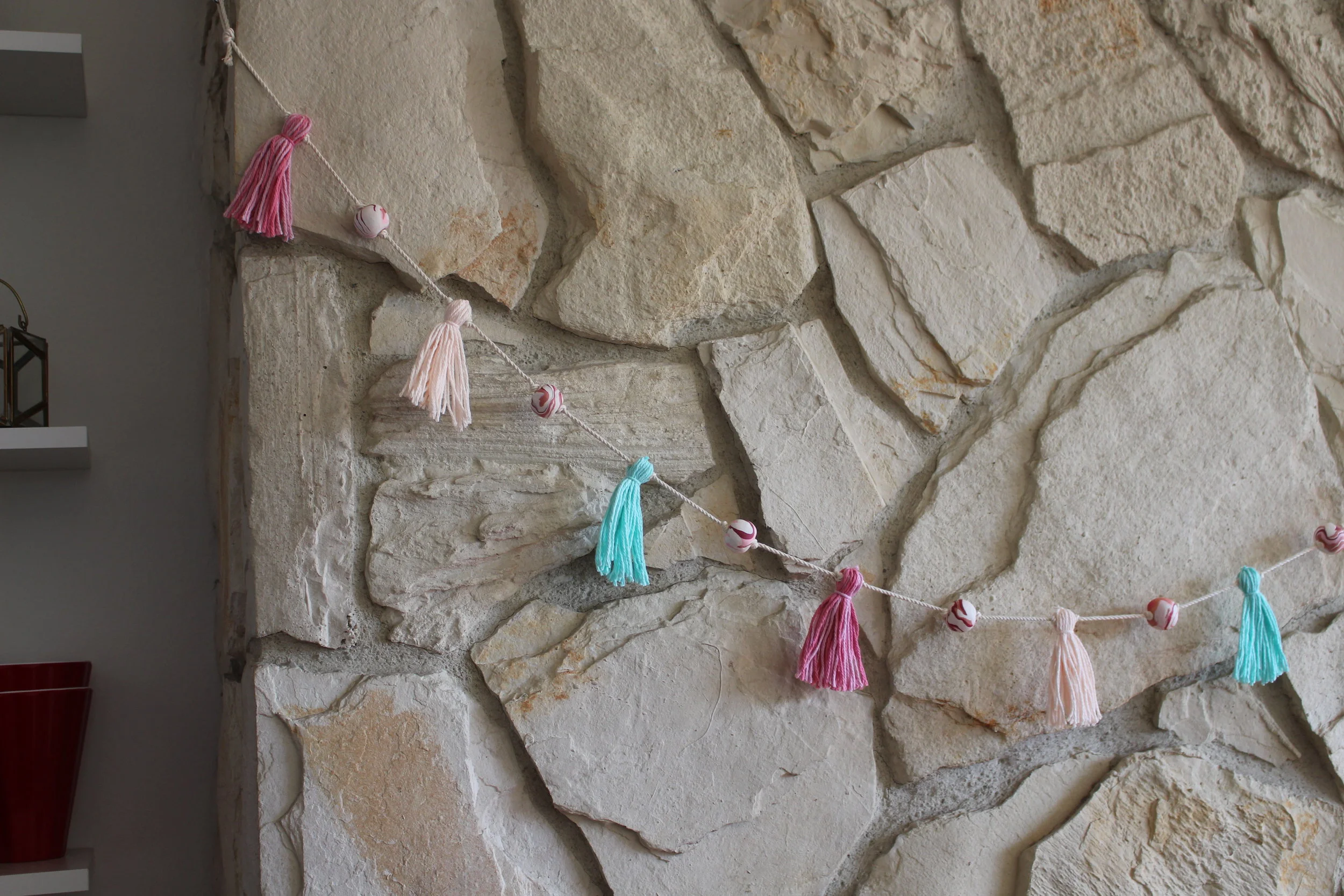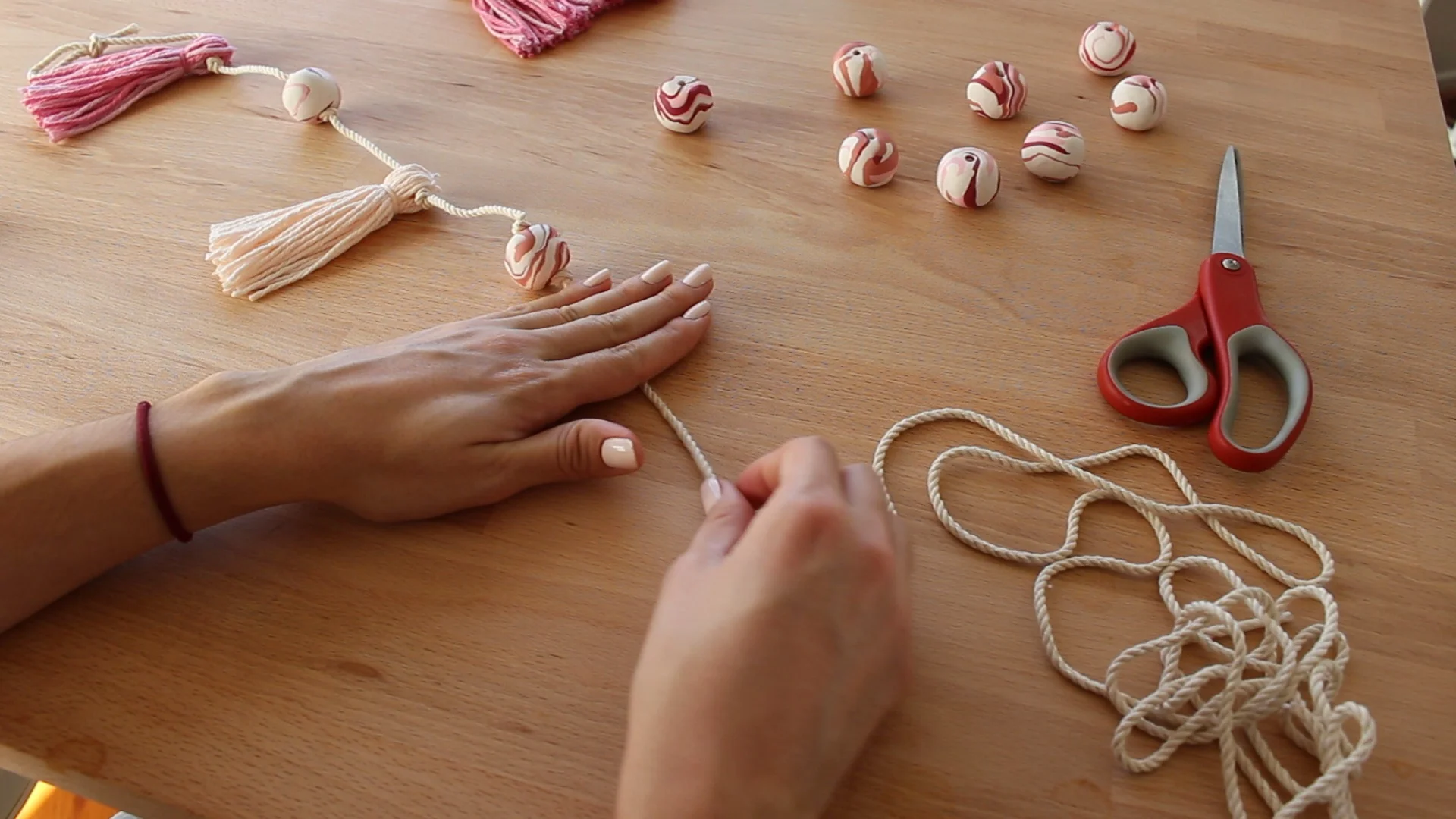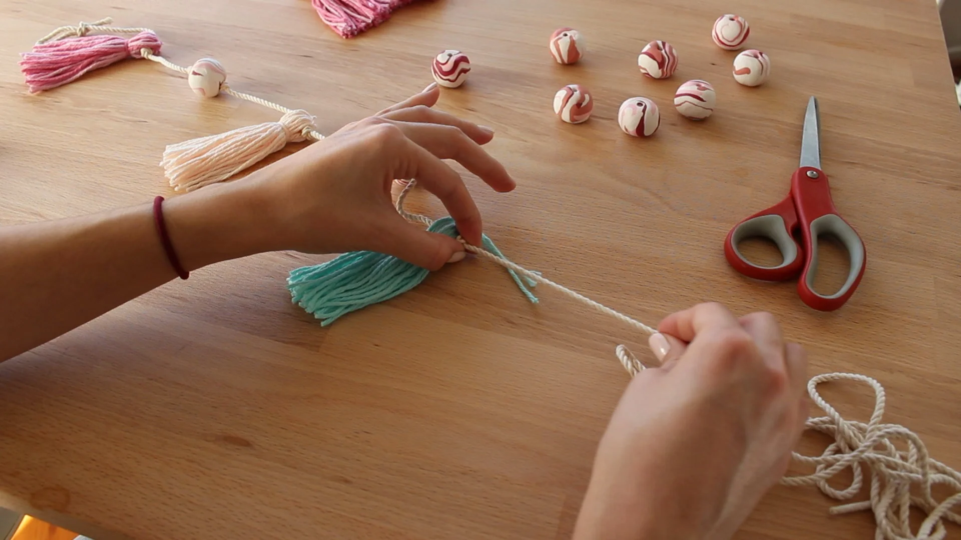 Step 12: Alternate with stringing on a marble bead and tassel to your garland rope. Create a knot on either side of each bead or tassel to secure the piece in place. I left about a 4-finger-width between each bead or tassel.