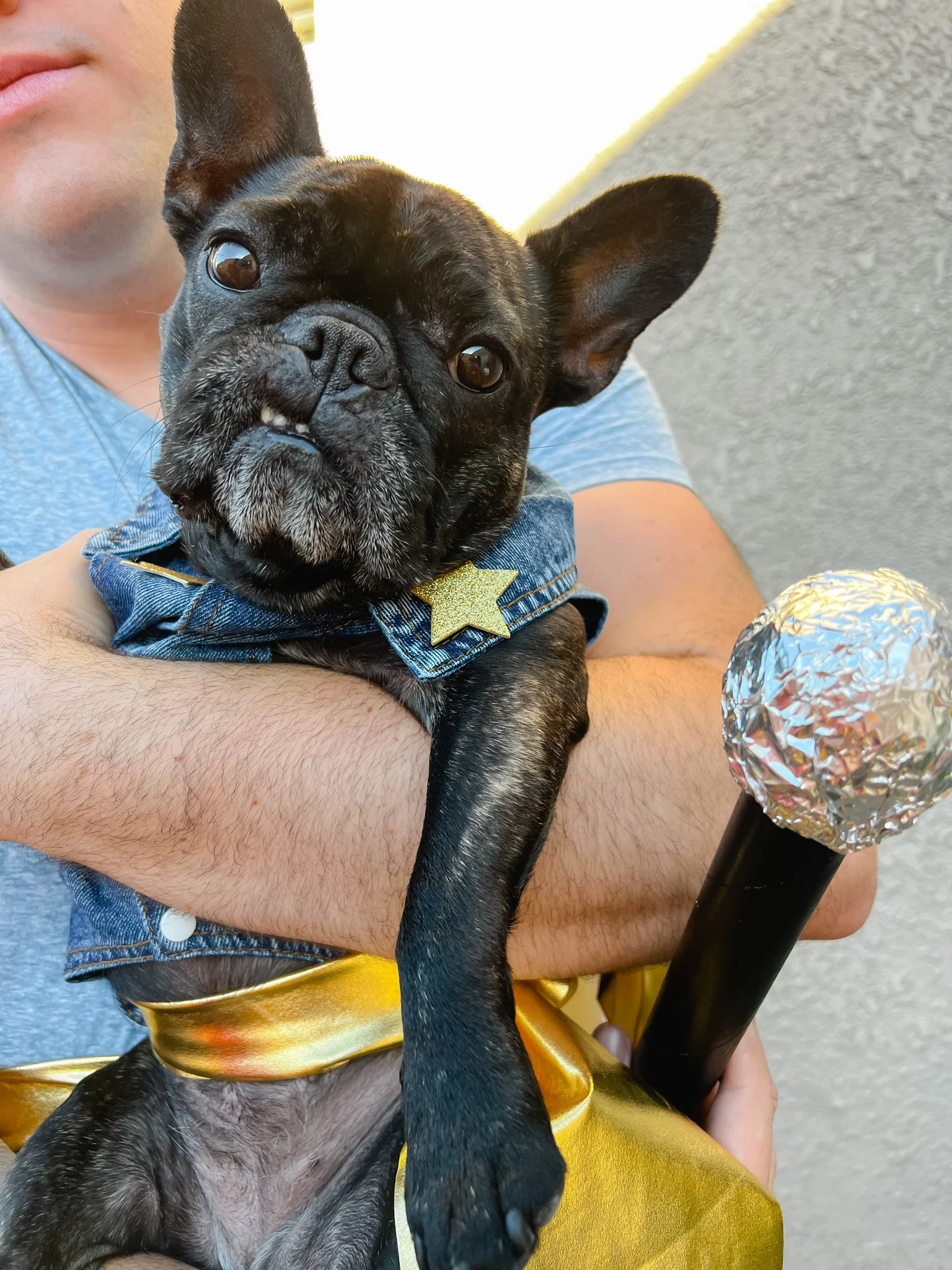 We, of course, could not resist getting Kevynn involved in our costume. Her denim vest was a must. We purchased this one in an XXL from Amazon. And I added a few sparkly glitter stars that I had on hand (here are similar ones) to match Donna’s star-embellished denim jacket in the movie. And her costume was complete with her own gold sash tied around her waist.