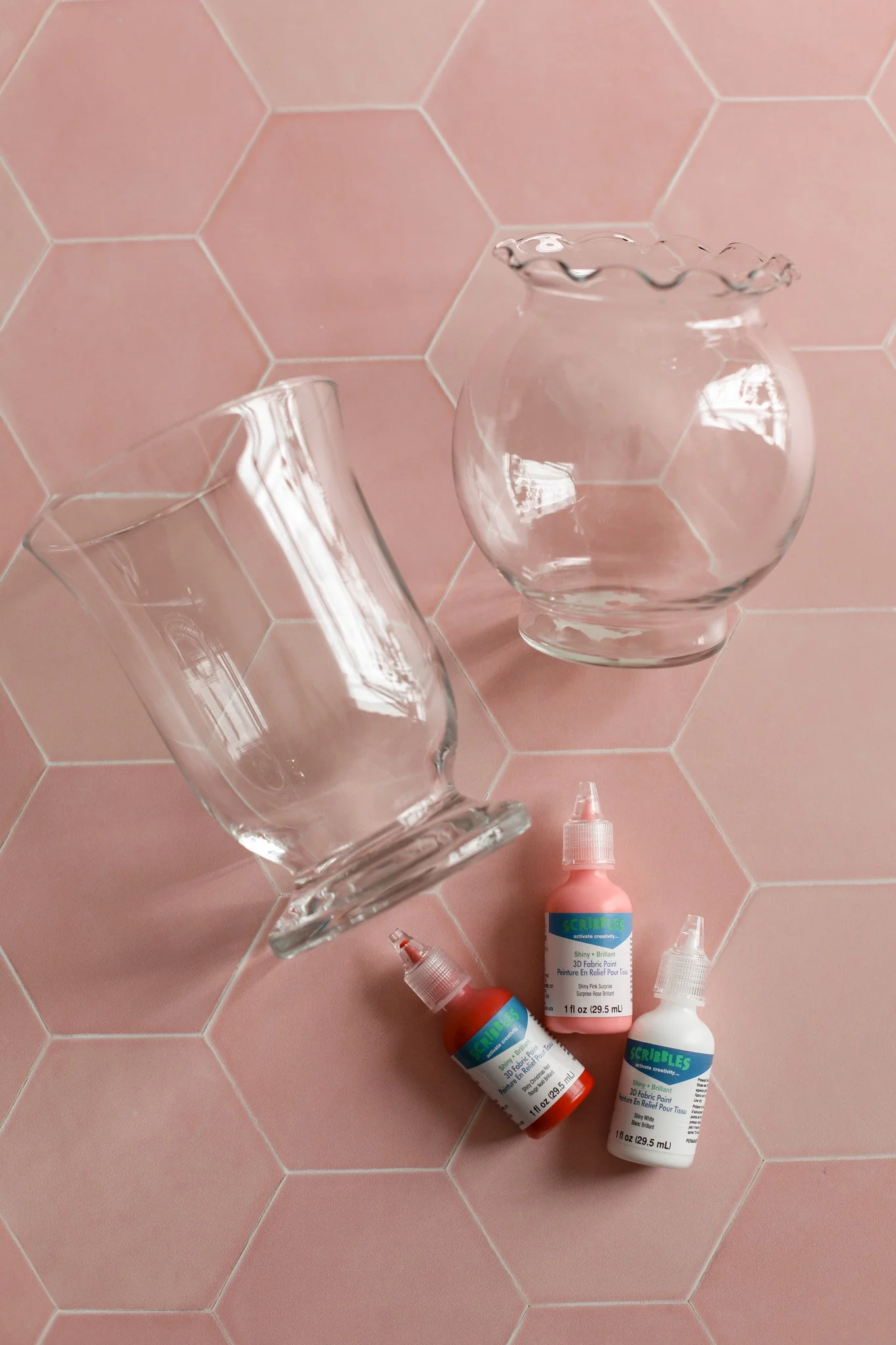 I went to my local thrift shop and found a few glass vases. They always seem to have so many different sizes and shapes for just a few dollars each. And I used some inexpensive 3D fabric paint to give them a whole new life! Check out the simple tutorial below :)
