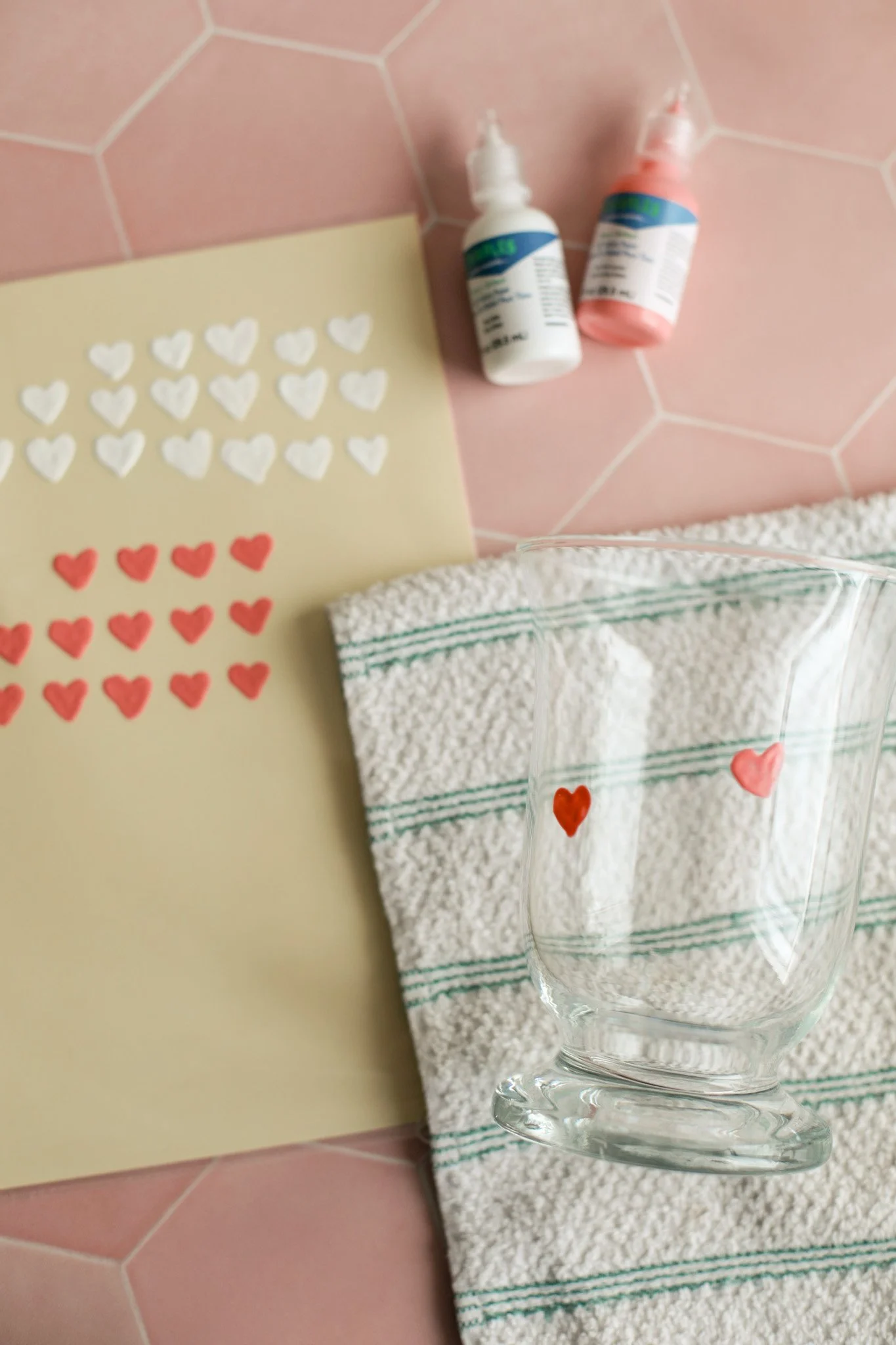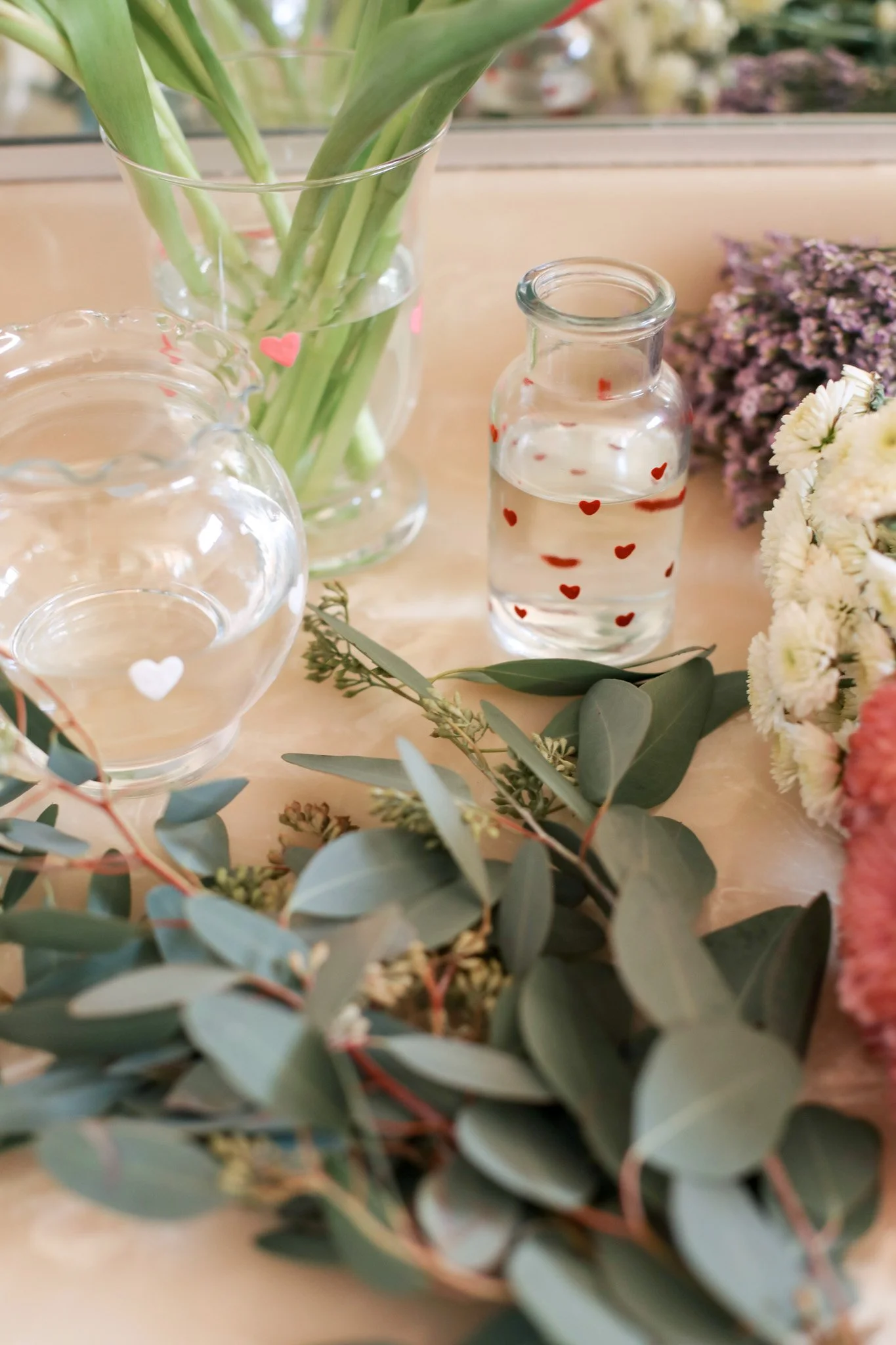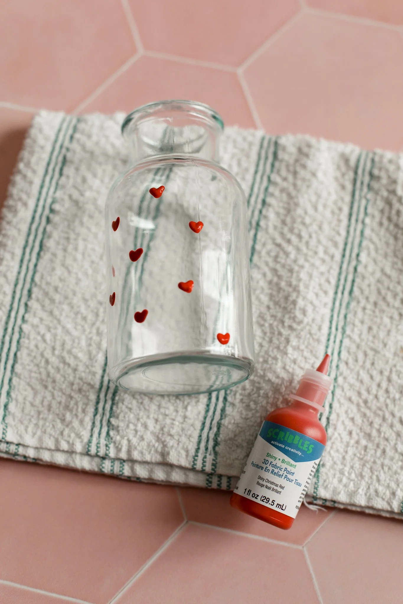 For this smaller vase, I wanted a bunch of tiny little hearts, so I actually just painted these right onto the glass vase. It is really hard to control the amount and direction of the paint in these little bottles, but I found that just making a tiny V-shape made cute little hearts.