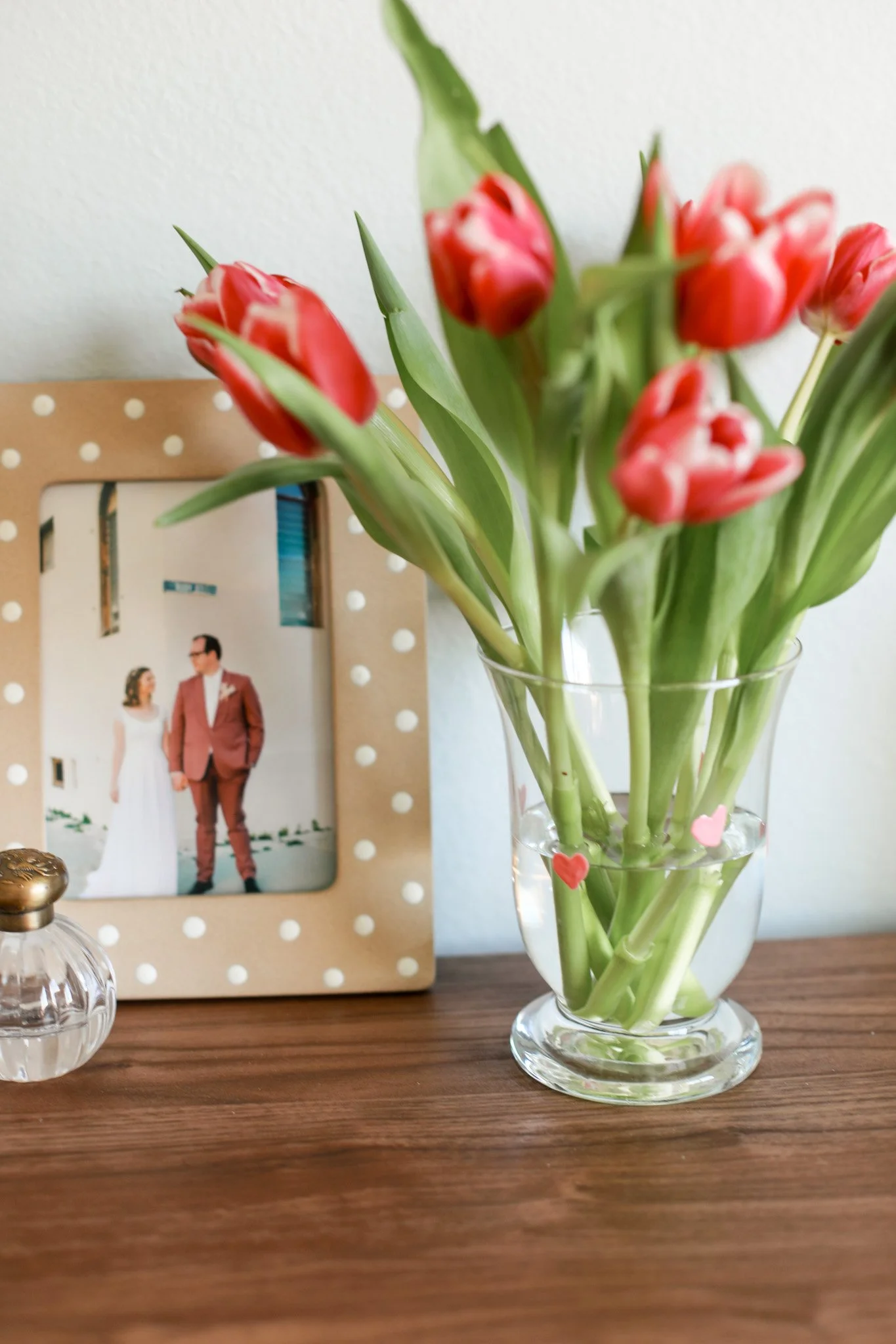 This project is so simple, it barely needs a tutorial! But I thought I would share it with you because it is a cute and inexpensive little piece of home decor you can make for Valentine’s day — or really any season!